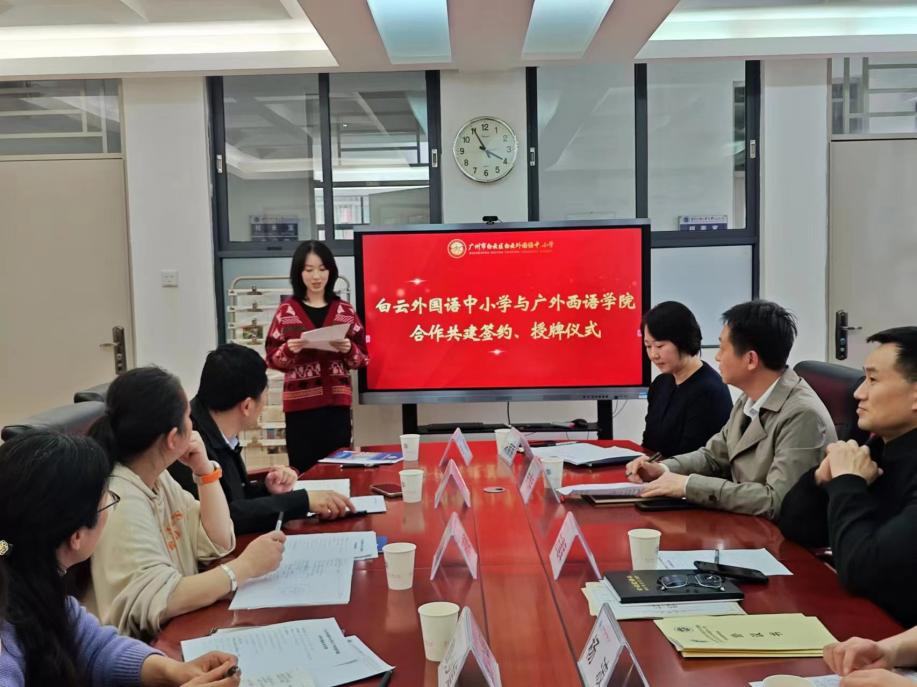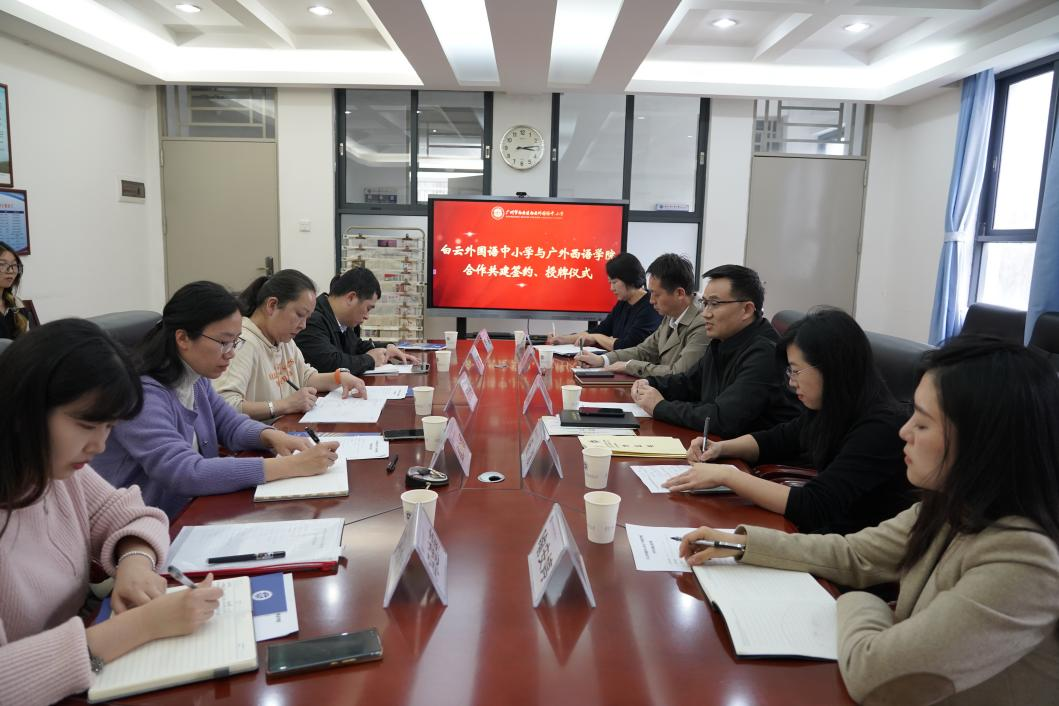 院长杨晓敏、副院长陈星、党委副书记魏少娟、辅导员冯迪南等一行到白云外国语中小学参加教学实践基地签署仪式暨合作交流座谈会。白云外国语中小学党支部书记兼校长方建军、党支部副书记朱传兵、教师发展中心主任杨波、小学英语科组长喻安婷等参加座谈。座谈会由白云外国语中小学校办副主任陈丽丽主持。