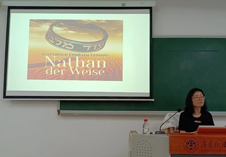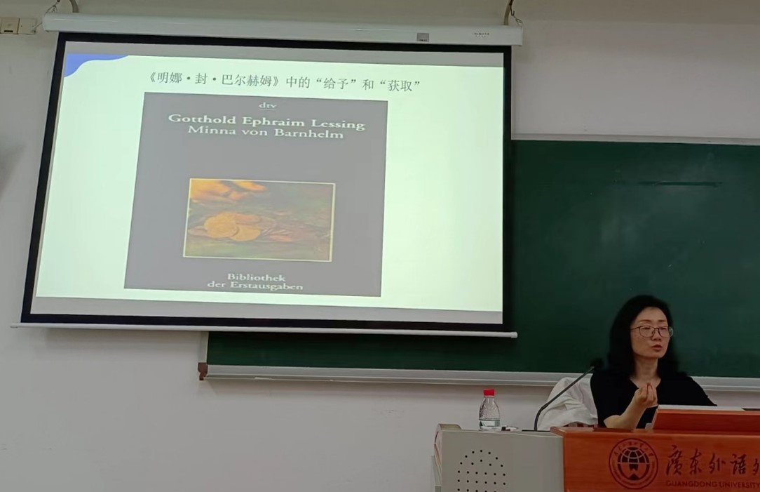 本网讯 2024年5月23日下午14点15分,四川外国语大学德语学院丰卫平教授受邀在第六教学楼B313教室举行宗岱人文讲坛学术讲座“‘给予’和‘获取’作为姿势的展演——莱辛戏剧《明娜·封·巴尔赫姆》《智者纳坦》中的经济问题演绎”。本场讲座由卢铭君教授致辞,由黄羽欢老师主持,到场师生积极参与,获益匪浅。