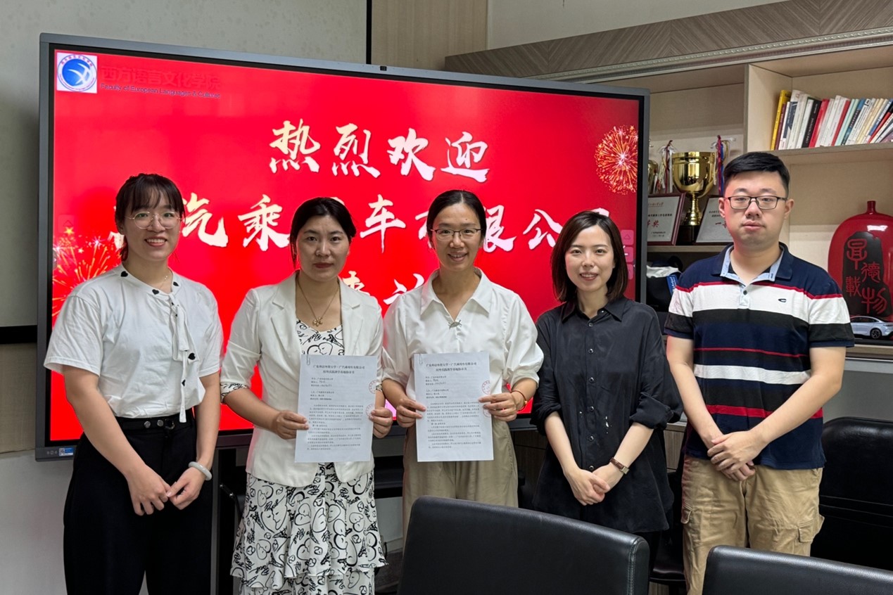 ·广汽乘用车有限公司校外实践教学基地”协议书签署仪式在学院207会议室举行。学院党委副书记魏少娟,俄语系系主任陈欢,辅导员杨潇、张阳与广汽乘用车有限公司(以下简称“广汽公司”)综合管理部招聘调配系系长陈小凤、系专员黄玫嘉参与仪式。活动由陈欢主持,俄语系十多名研究生一起参加宣讲。