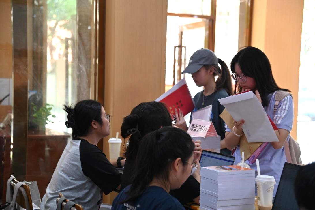 迎新工作人员在第四教学楼集合,做好各项准备工作之后,等待着迎接2024级入学新生。