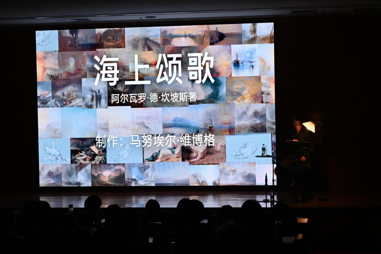 在马努埃尔的朗诵表演中,坎波斯的诗句仿佛与海水融为一体,时而如惊涛拍岸般激烈,时而如深海般静谧。表演者不仅以诗人的视角呈现情感,更生动地演绎了诗中的水手与海盗形象。由马努埃尔设置的背景乐音和印象派海洋系列油画背景与朗诵表演相得益彰,多维度全方位地传递诗歌内在复杂的感官表达,让每一位在场师生都获得深度沉浸式的诗歌视听体验。