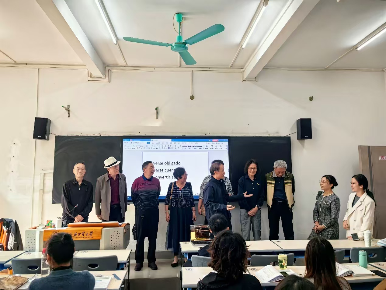 学院副院长陈星邀请年近70的大师兄大师姐们走进西班牙语课堂,与23级西班牙语的小师弟小师妹面对面。老少相对,课堂气氛热烈。校友们结合个人的人生经历,围绕外语人的使命、专业发展前景、跨文化交流的重要性、文学翻译的要点等与学生们畅谈交流,勉励大家既要扎实专业能力,又要有大局精神、奉献精神,勇于担当青年责任,服务社会,回报祖国,成为国家的栋梁之才。同学们对大师兄大师姐的分享报以热烈的掌声致敬。