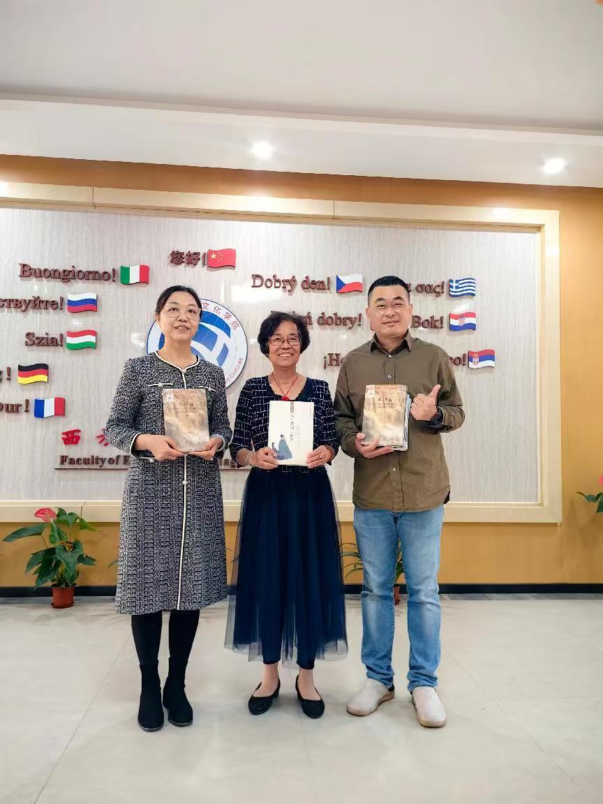 优秀校友陈笑珍为学院西班牙语系赠送她与先生——北外首任西语教授王怀祖共同翻译的《西译宋代诗词三百首》与大中华文库《西汉对照宋词选》,并祝愿中西文化交流源远流长,寄语师弟师妹珍惜在校学习时光,不断充实自己,拓宽视野,积极传承中华文化精髓,讲好中国故事,努力在国际文化交流中展现西语担当。编著了《走近墨西哥》《走读墨西哥名胜古迹》的优秀校友谢沛江用西班牙语和同学们进行了交流。