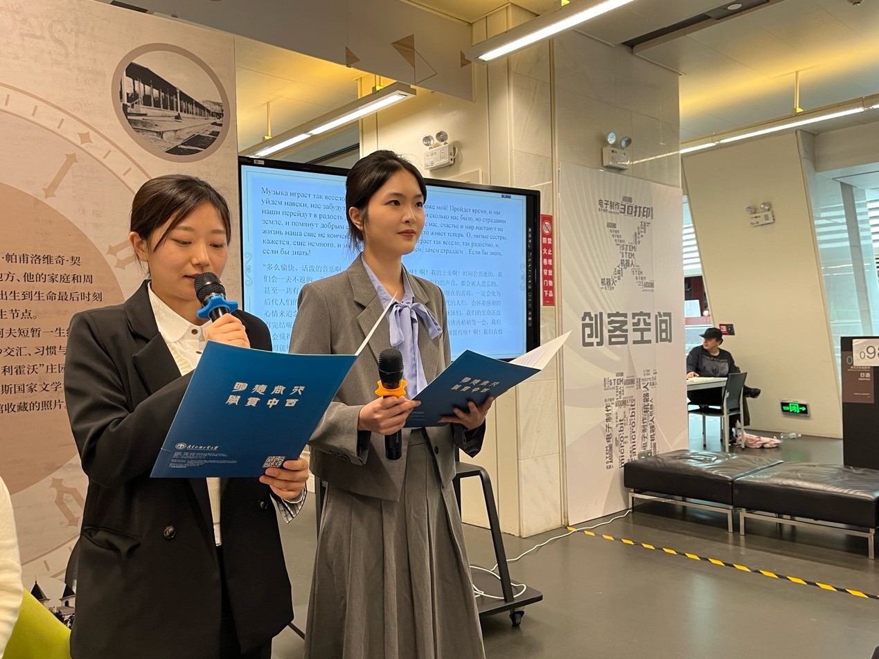“悦读分享会”活动开始之前,梁玮琦老师为公众导赏了展览。之后俄语系24级口译专业研究生李思桐、21级本科生温柔带来了俄中双语朗诵契诃夫戏剧《三姐妹》片段的精彩表演,丰富了读者观展体验。