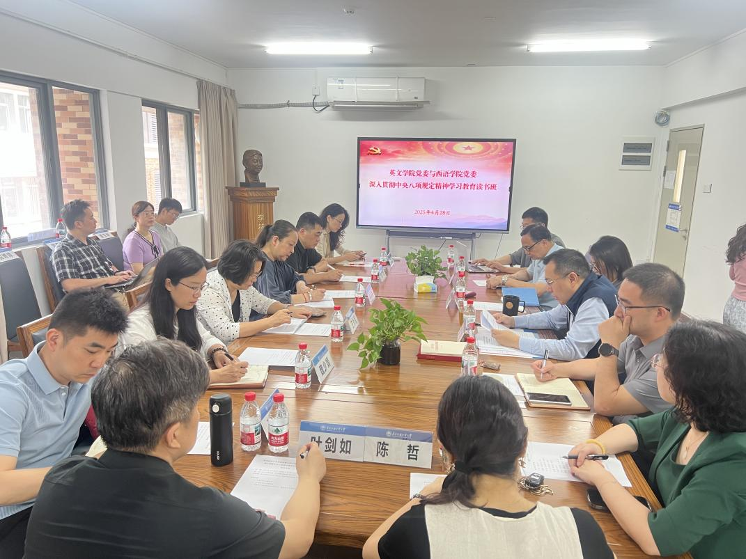 党委与英语语言文化学院党委联合举办深入贯彻中央八项规定精神学习教育读书班。本次活动以作风建设与学科建设深度融合为主线,通过联学共研凝聚发展共识,开启两院协同发展新篇章。