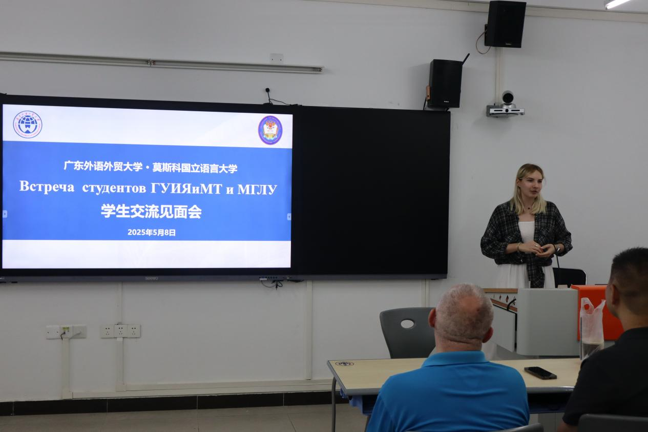 本网讯 2025年5月8日晚,为更好落实浪live 国际交流合作“PRIME计划”,并进一步推进国际化办学体系建设,浪live 俄语系联合广外全球学生交流大使团在白云山校区一教南楼307室举办了与莫斯科国立语言大学的校际学生交流见面会。俄语系主任陈欢老师、姜超老师、梁玮琦老师,以及外教沙拉夫特季诺夫·扎力到场交流,俄语专业40余名学生踊跃参与,现场气氛热烈,交流互动频繁。