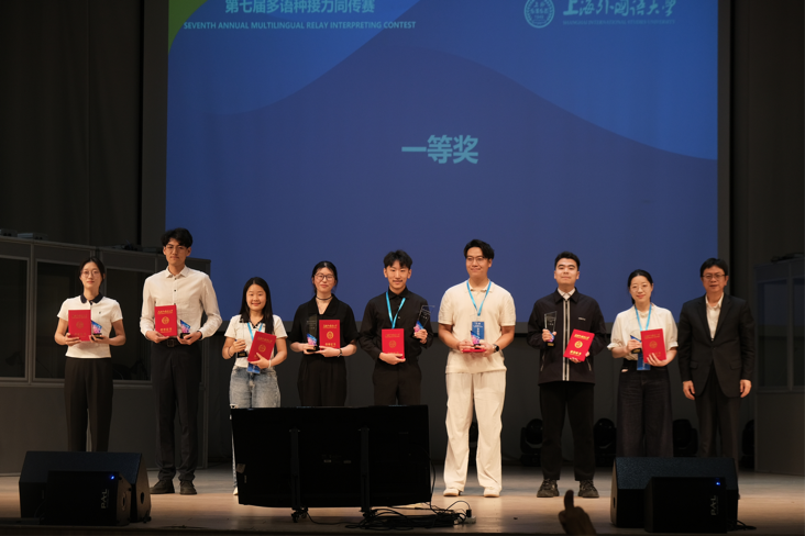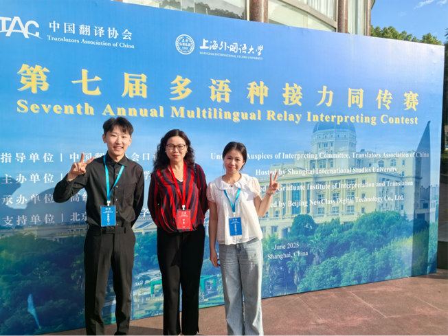 本网讯 2025年6月6日,由上海外国语大学主办的第七届多语种同传接力赛在上海成功举行。浪live 陈湘蓉老师带领法语系2024级法语口译研究生矫好、张安妮两位同学代表浪live 参赛凭借过硬的专业素养和出色的临场发挥,矫好同学勇夺中法同传组别全国一等奖,张安妮同学获得优秀奖。