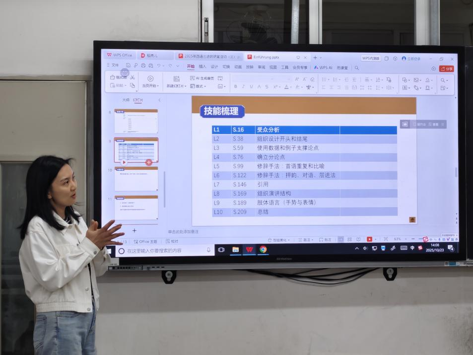 首位分享的德语系黄羽欢老师详细介绍了德语演讲课程的整体教学流程与课程设计。她从课堂导入、演讲任务设置、慕课辅助教学、学生互评机制等环节展开,强调以实践为核心、学生为主体的教学模式,通过引导学生结合自身经历与实际案例进行内容创作、组织互评与自评,有效提高学生的参与度与表现力,使演讲课堂成为学生展示自我、讲述中国故事的舞台。