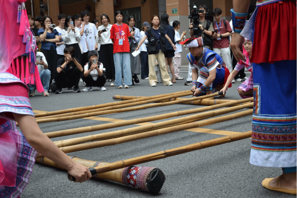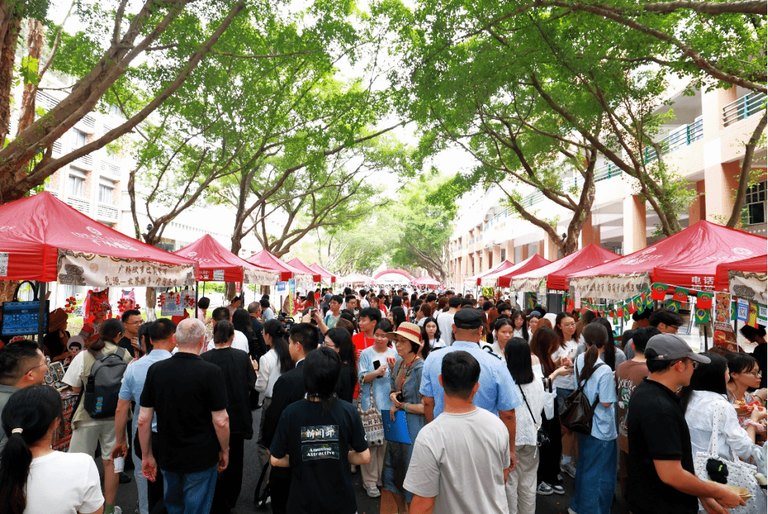 本届文化节的一大亮点,是学校“百千万工程”结对单位的倾情参与。清远乡村振兴特色摊位前人头攒动,笋尖、清远鸡、五指毛桃等农特产品从田间直达校园,师生们在品尝地道农味的同时,感受乡村发展的蓬勃活力。乳源瑶族自治县的特色展位则以民族文化点亮现场,身着瑶绣服饰的瑶族同胞现场演绎竹竿舞——作为国家级非物质文化遗产,瑶绣被誉为“穿在身上的史书”,而竹竿舞的互动体验,让嘉宾与师生在欢声笑语中,沉浸式感受过山瑶文化的独特魅力。来自白云区永平街岭南新世界片区党群服务中心的“邻里暖屋”慈善超市摊位则带来慈善好物义卖、特色文创展销、暖心手作体验,用一份小消费传递一份大爱心,同时现场招聘志愿者,让青春与善意同行,用实际行动温暖邻里。